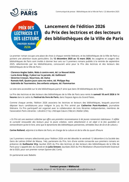 Prix des lectrices et des lecteurs des bibliothèques de la Ville de Paris 2026